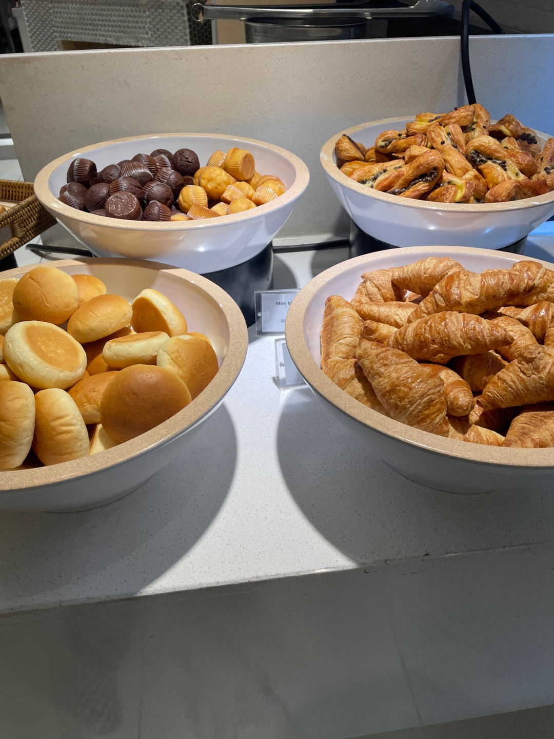 각종 잼, 크림치즈, 화이트브레드, 베이글, 미니머핀, 미니초콜릿 트위스트, 모닝빵, 크로와상