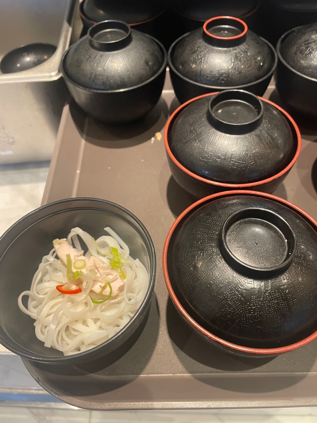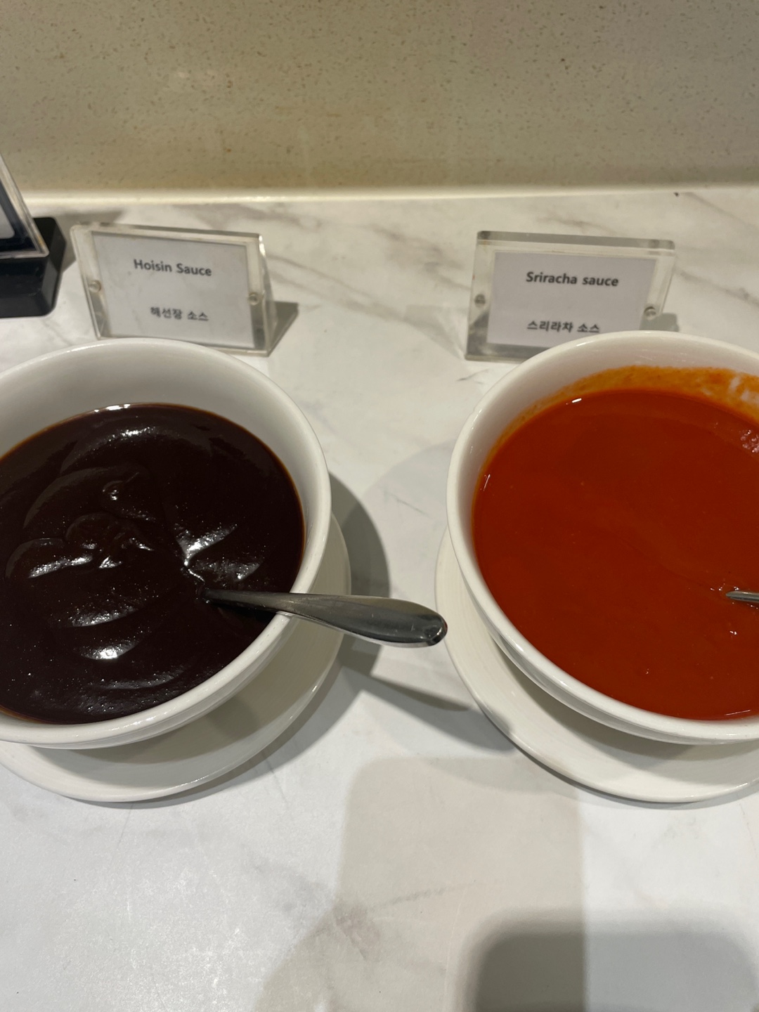 된장국, 계란 야채죽, 계란후라이, 쌀국수, 해선장 소스, 스리라차 소스