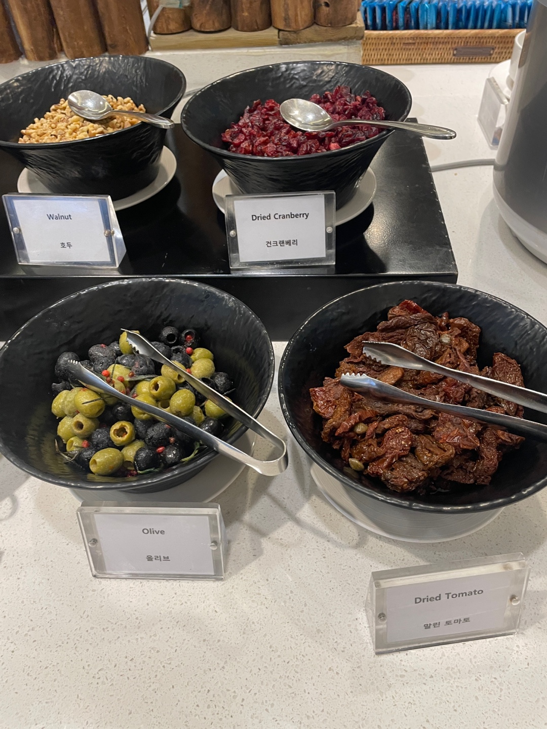 아몬드 슬라이스, 에멘탈 치즈, 크루통, 호두, 건크랜베리, 올리브, 말린 토마토