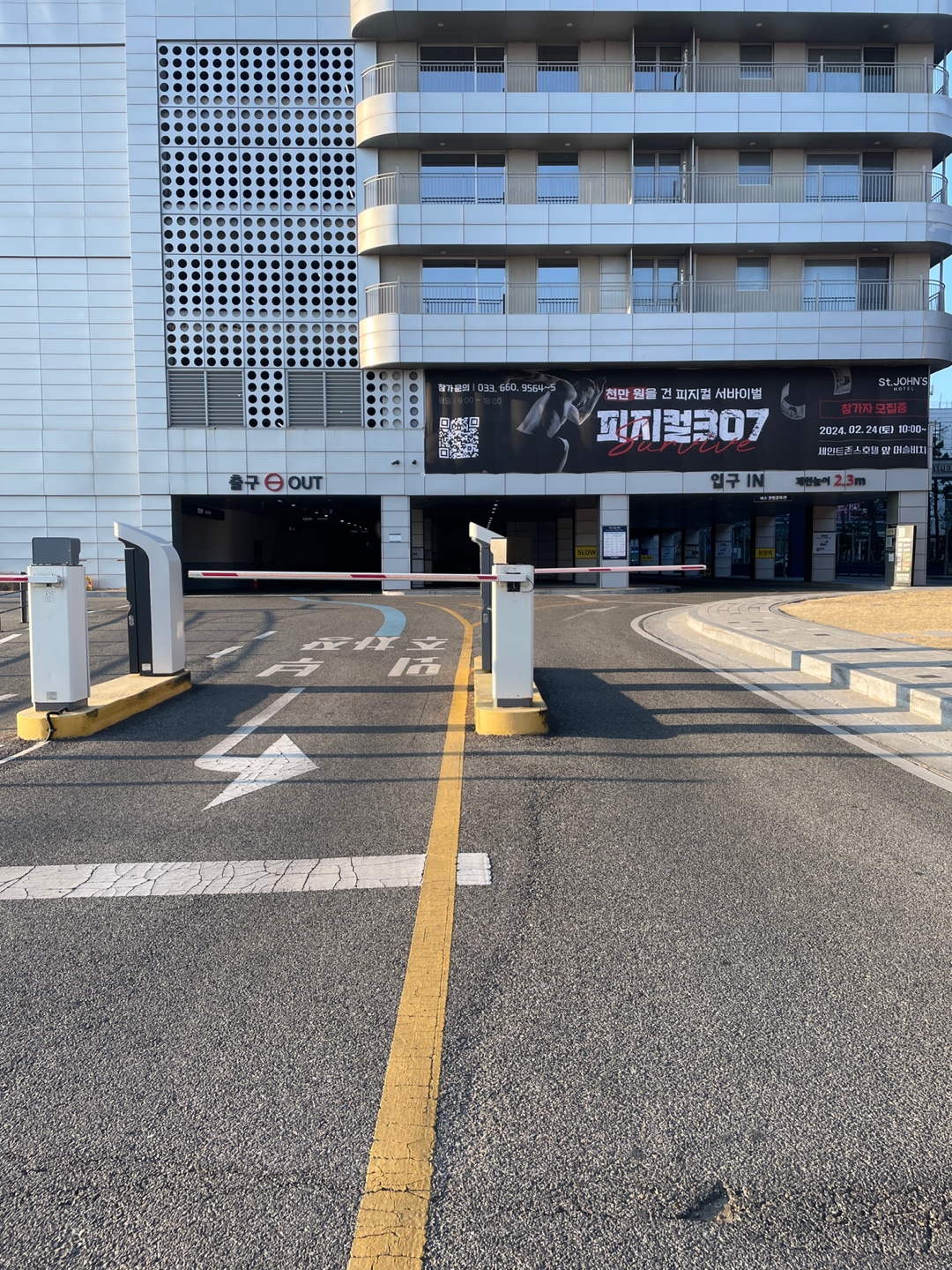 주차장 출입구는 아래와 같이 되어 있으며 지하 1층부터 지상 3층까지 주차할 수 있습니다.