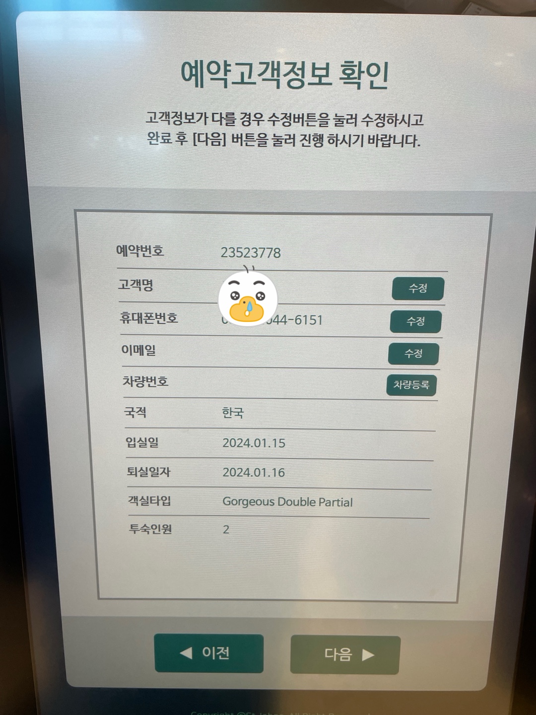 차량번호, 휴대폰번호를 입력하고 조식 결제까지 키오스크에서 진행했습니다.