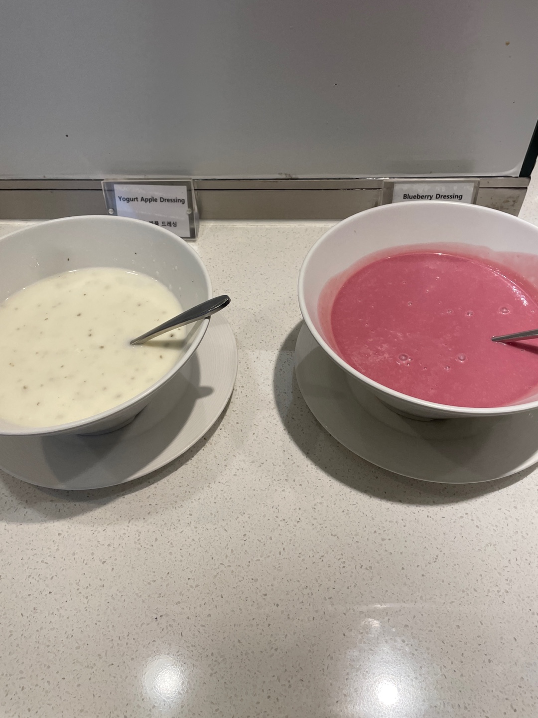 치킨시저샐러드, 연어샐러드, 믹스샐러드, 양상추, 드레싱(유자레몬, 오리엔탈, 요거트애플, 블루베리)